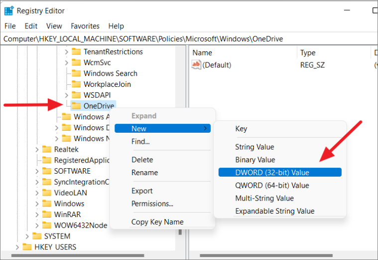 Step 4: Right-click on the OneDrive key, select New > DWORD (32-bit) Value, and name it DisableFileSyncNGSC.