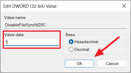 Step 5: Double-click on DisableFileSyncNGSC, set the Value data to 1, and click OK.