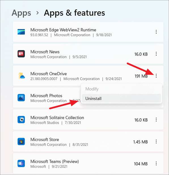 Step 3: Scroll through the list of installed apps to find Microsoft OneDrive. Click on the three vertical dots next to it and select Uninstall.