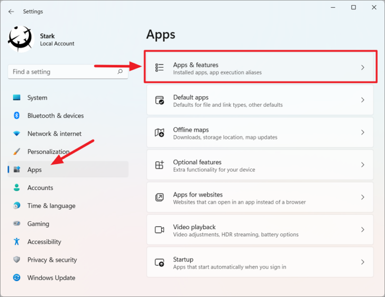 Step 2: In the Settings window, select Apps from the left sidebar, then click on Apps & features on the right.