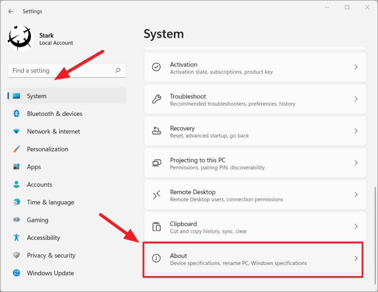 Step 1: Open Windows Settings by pressing Windows + I. Select System from the left sidebar, then scroll down and click on About.