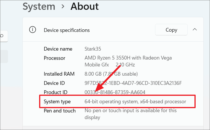 Step 2: Under Device specifications, check the System type to find out if your system is 32-bit or 64-bit.