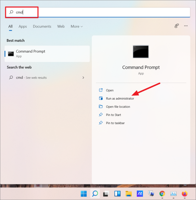 Step 3: Open Command Prompt as an administrator. Click the Start menu, type CMD or Command Prompt, then select Run as administrator on the right.
