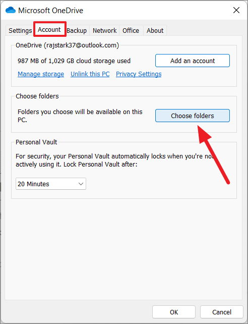 Step 3: In the settings window, go to the Account tab and click on Choose folders.