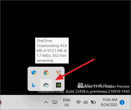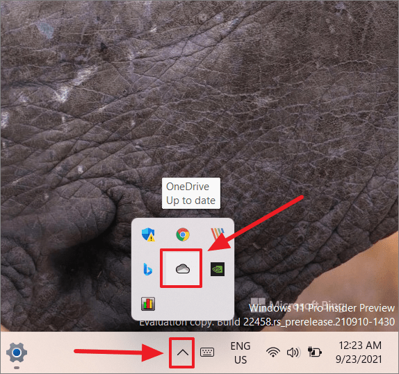 Step 1: Click the Show hidden icons arrow on the taskbar and select the OneDrive icon.