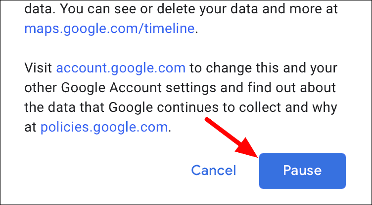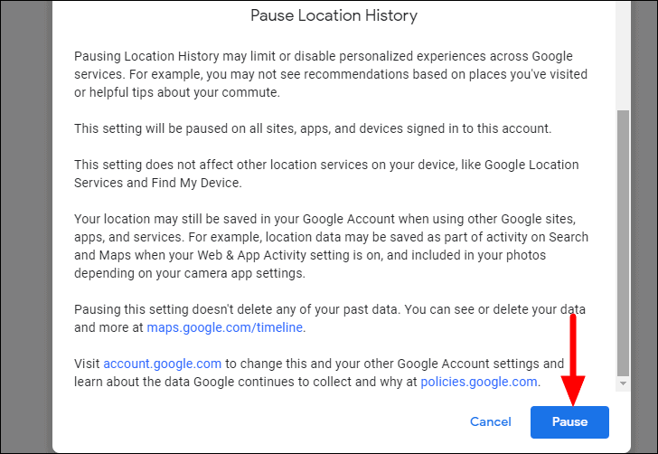 Next, a window will launch detailing how disabling the Location History will affect the Google service. Scroll down to the bottom of it and then click on the ‘Pause’ option.