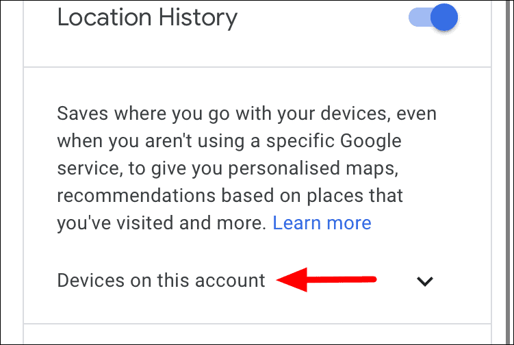 To disable Location History for a particular device, tap on ‘Devices on this account’ instead of tapping the toggle next to ‘Location History’.