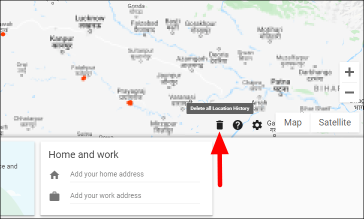 To delete the complete location history for the account, click on the ‘Delete’ icon on the Google Timelines window that you opened earlier.