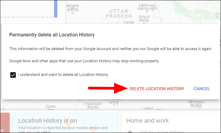 A confirmation box will now pop up. Tick the checkbox for ‘I understand and want to delete all Location History’, and then click on the ‘DELETE LOCATION HISTORY’ option at the bottom.