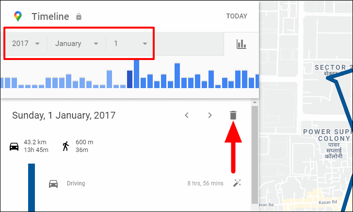 To delete a single day from Location History, first select the date from the drop-down menus at the top-right corner. The first is the year, the second is for the month and the third is the day. After you have set a filter, the Location History for that particular day will be displayed on the screen. Now, click on the ‘Delete’ icon.