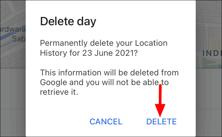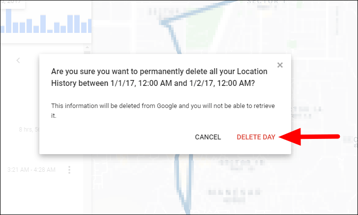 A confirmation box now pops up, click on ‘DELETE DAY’ to confirm the changes and delete the location history for that particular day.
