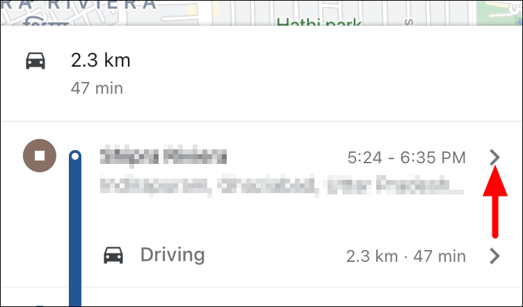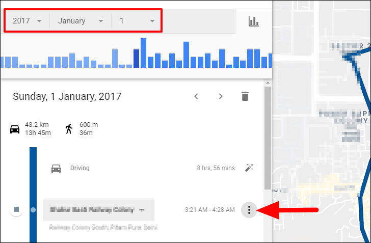 To delete a stop from Location History, select a date, as you did earlier. Now, the Location History for the selected date will be displayed. Next, locate the stop that you want to delete and click on the ellispsis next to it.