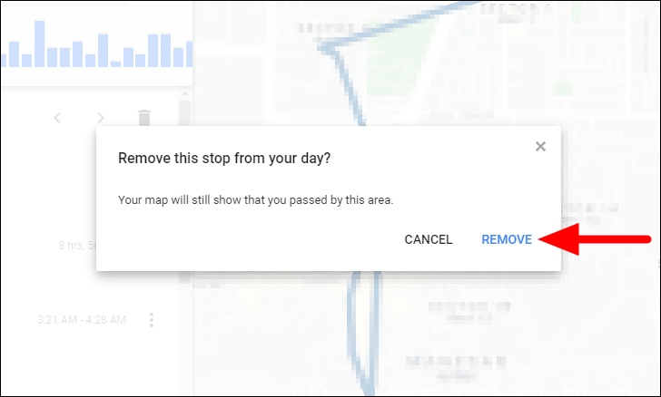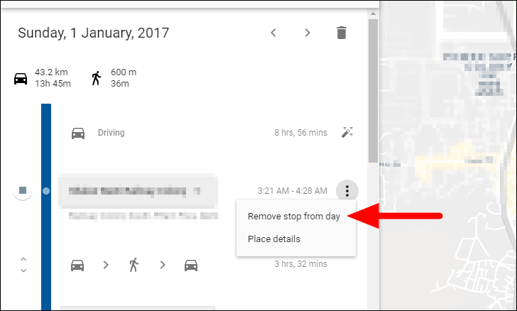 Finally, click on ‘Remove’ to delete that stop. Although the stop is deleted from the Location History and is no more listed as a separate entry, it will continue to show on the map.