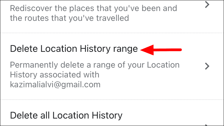 Next, locate and tap on the ‘Delete Location History range’ option in the list.
