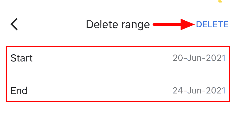 Now, choose a time range by first tapping on the ‘Start’ option, selecting the starting date, then tap on ‘End’ and select the end date. Once you have set a time range, tap on ‘Delete’ at the top-right corner.