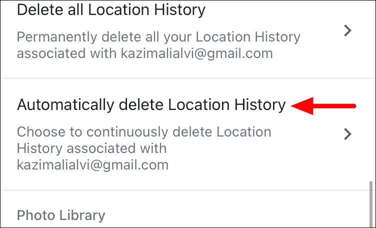 Next, locate and tap on the ‘Automatically delete Location History’ option from the list.