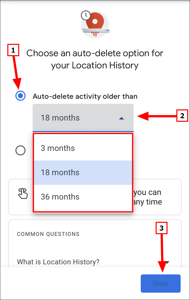 Now, select the checkbox for ‘Auto-delete activity older than’, tap on the drop-down menu below it, select an option, and then tap on ‘Next’ at the bottom.
