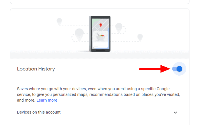 To disable Location History for the account and all linked devices, click on the toggle next to ‘Location History’.