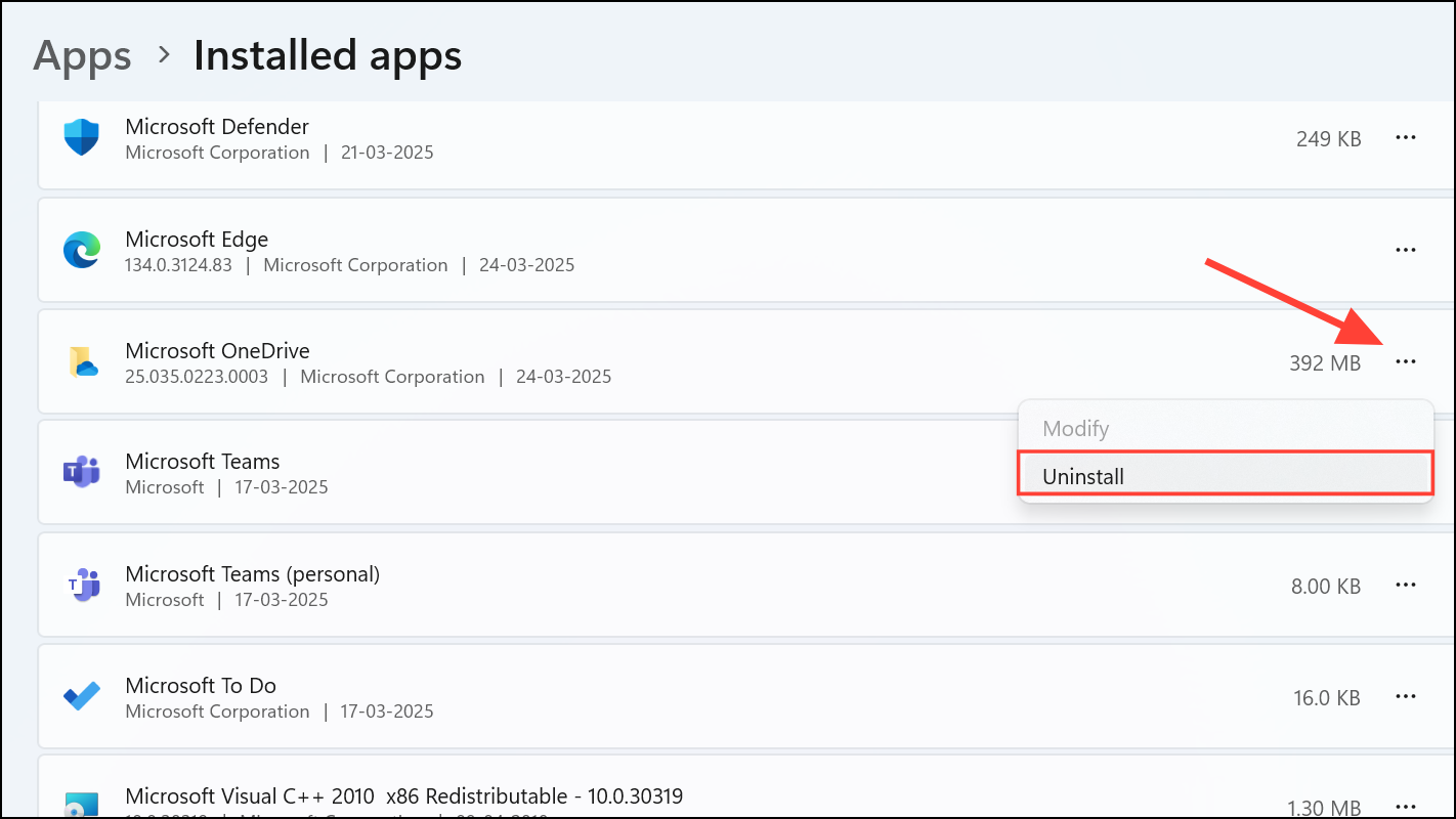 Step 4: Click the three-dot menu next to "Microsoft OneDrive" and choose "Uninstall." Confirm your choice when prompted. If the "Uninstall" option is greyed out, select "Modify" instead and then choose to disable OneDrive. After completing these steps, you may need to restart your system to finalize the removal.