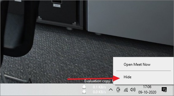 To simply remove the ‘Meet Now’ button from Windows 10 taskbar, right-click on the icon and select ‘Hide’ from the available options.