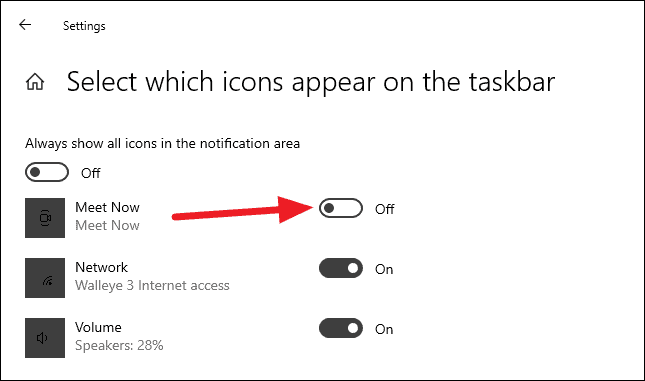 On the next screen, turn off the toggle switch next to ‘Meet Now’ to move the icon to the Notification area.