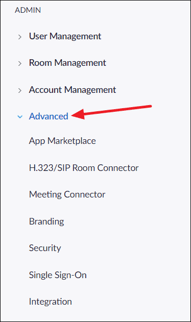 Go to zoom.us/signin and login with your Zoom account with the admin access. Then, click on the ‘Advanced’ option available in the navigation panel on the left.