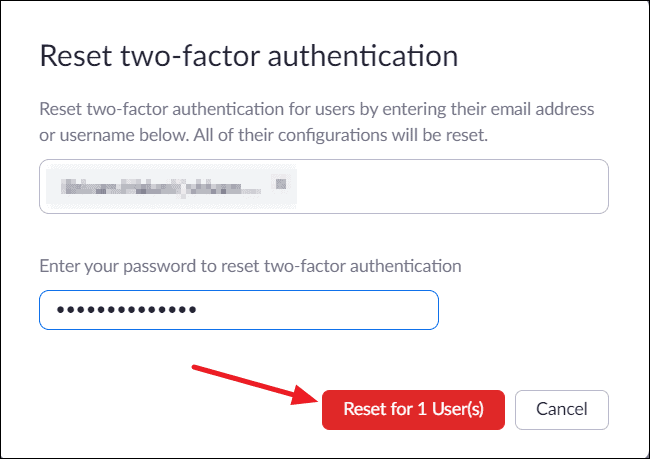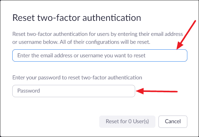 You will be asked to enter the ‘E-mail address’ of the user whose two-factor authentication you want to reset, and your account password. You can also enter the email address of multiple users if needed.