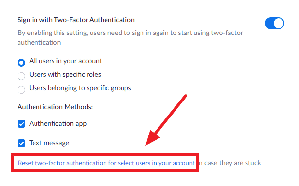 Scroll-down on the security settings page until you see the Two-Factor Authentication settings. Under this section, click on the ‘Reset two-factor authentication for select users in your account’ link. This will be a highlighted text present just above the sign-in methods.