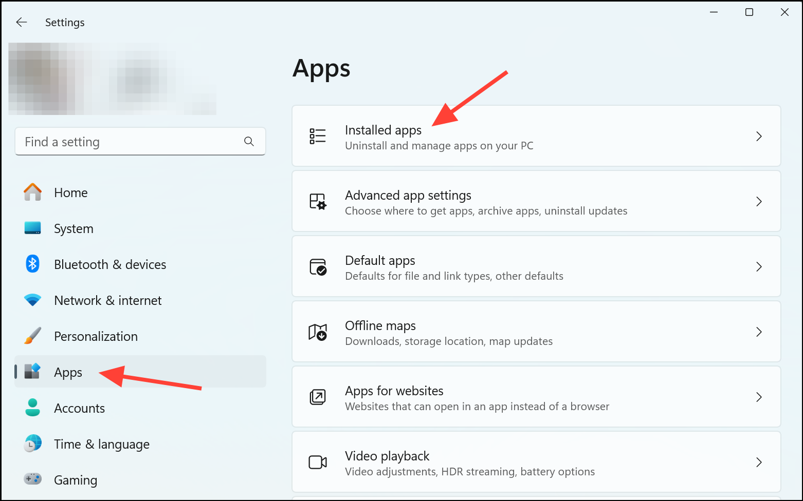 Step 2: In the Settings window, click on Apps in the left-hand menu, then select Installed apps on the right to view all applications installed on your system.