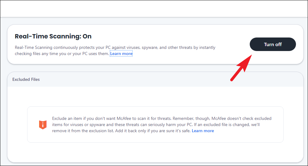 Step 3: From the left sidebar, select Real-Time Scanning. On the Real-Time Scanning page, click on the Turn Off button.