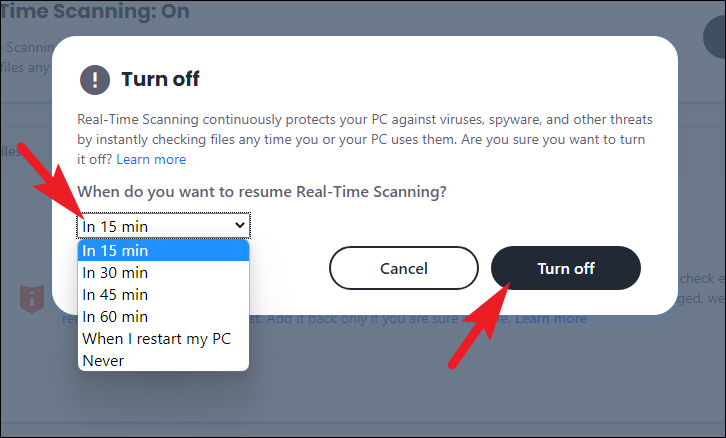 Step 4: A prompt will appear asking for the duration to disable real-time scanning. Choose your preferred time frame from the drop-down menu, or select Never to turn it off indefinitely. Click on Turn Off to confirm.