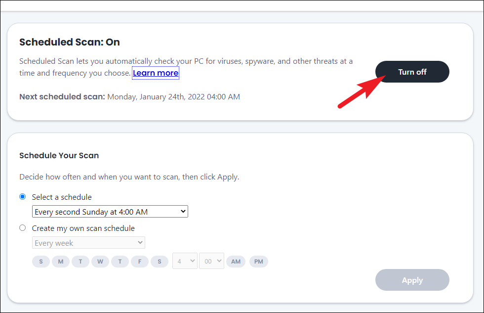 Step 5: Return to the sidebar and click on Scheduled scans. On the Scheduled Scans page, click on Turn Off to disable scheduled scanning tasks.