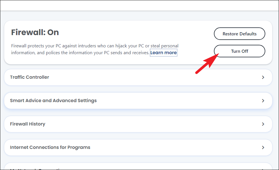 Step 6: To disable the firewall, select Firewall from the sidebar. On the Firewall page, click on Turn Off. Choose the duration you prefer and click on Turn Off to disable the firewall protection.