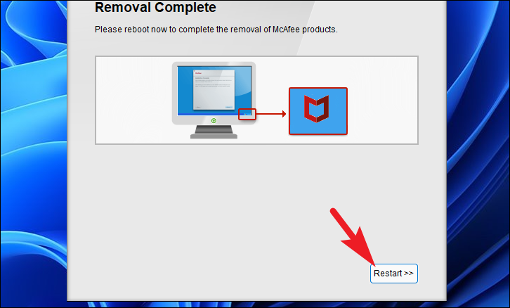 Step 7: The uninstaller will remove the selected McAfee products. Wait until the process completes. You may be prompted to restart your computer; if so, save any open work and restart your system to complete the removal.