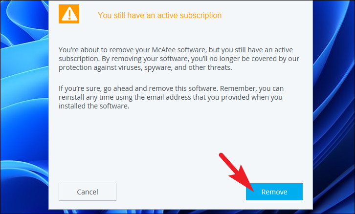 Step 6: If you have an active subscription, a notification will appear. Review the information, and click on Remove again to confirm and continue with the uninstallation.