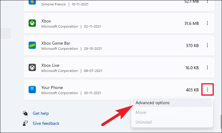 - Click the three-dot menu next to the app and choose
