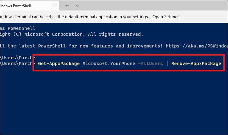 Uninstall the Your Phone app using PowerShell
