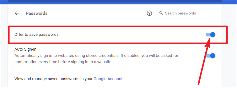 Step 3: At the top of the Passwords settings page, you'll find the option labeled Offer to save passwords. Toggle this option off to prevent Chrome from prompting you to save passwords when you log into websites.