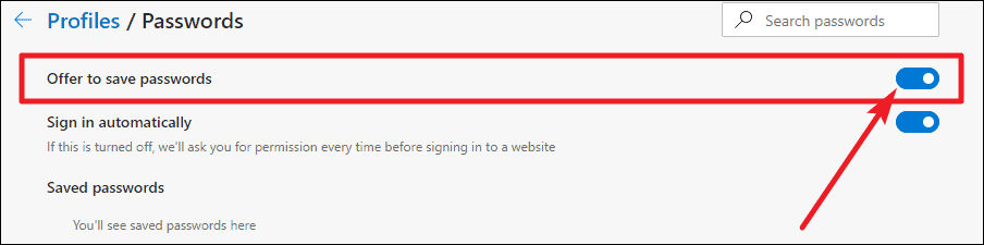Step 3: At the top of the Passwords settings page, locate the option titled Offer to save passwords. Toggle this setting off to stop Edge from asking if you'd like to save passwords when you sign in to websites.