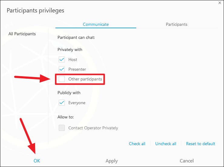 A ‘Participant privileges’ box will appear. From there, make sure the ‘Communicate’ tab is selected and then under the ‘Participants can chat: Privately with’ section, uncheck the ‘Other Participants’ box, and hit the ‘OK’ button on the bottom left corner of the box.