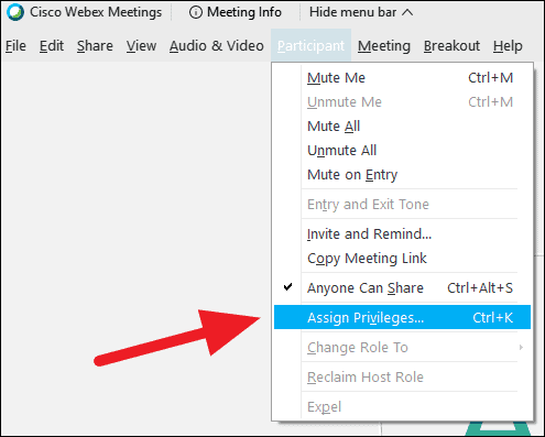 In an ongoing WebEx meeting (where you’re the host), click on the ‘Participant’ option from the top menu bar. Then select the ‘Assign Privileges…’ from the available options.
