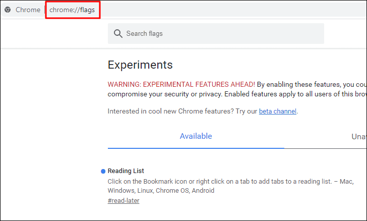 Step 2: At the top of the Chrome Flags page, you'll find a search box. Type 'Reading List' into the search box to locate the relevant flag quickly. The 'Reading List' flag should appear in the search results, usually set to 'Default'.