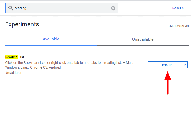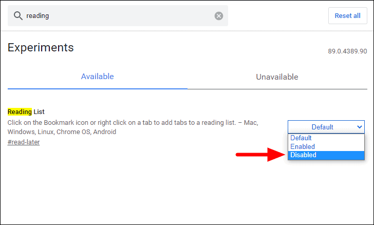 Step 3: Click the dropdown menu next to the 'Reading List' flag. From the options that appear, select 'Disabled' to turn off the feature.