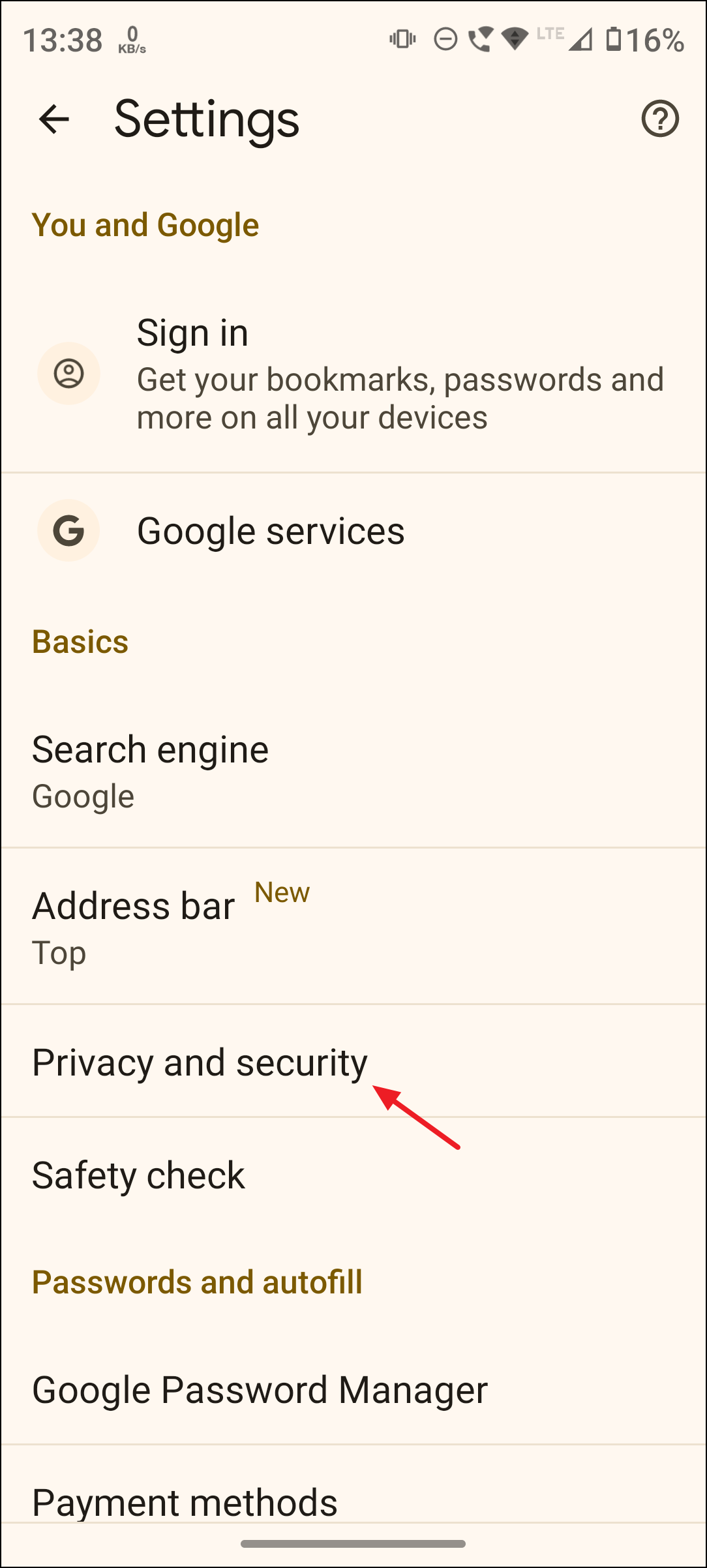 Step 2: On the Settings page, tap on Privacy and security.