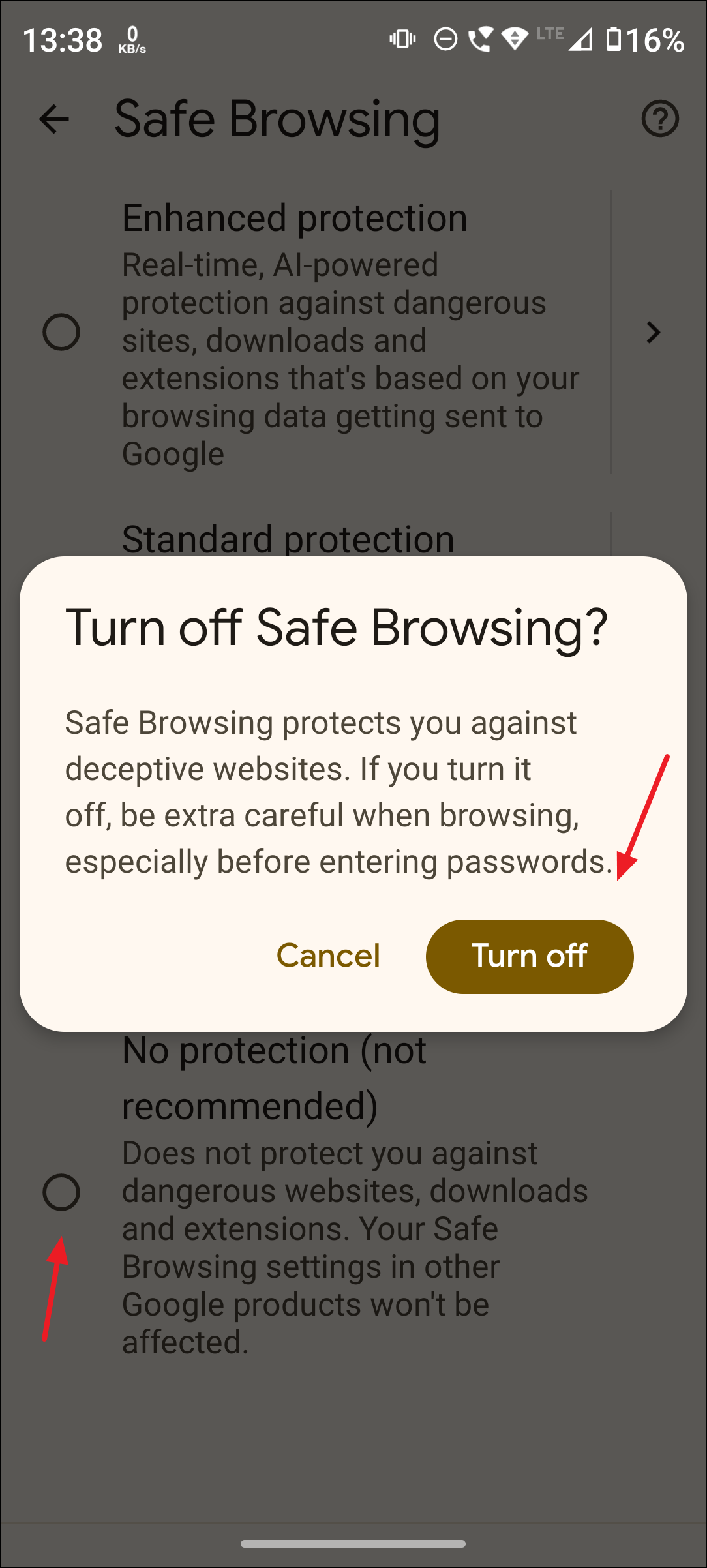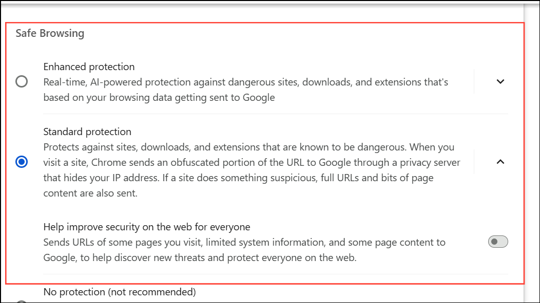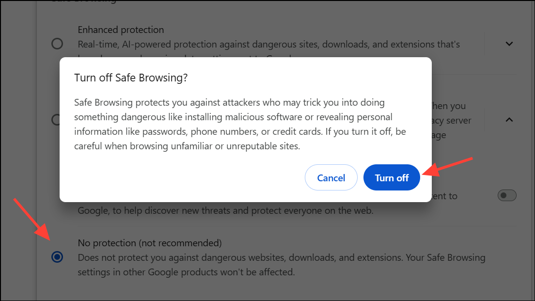Step 4: Select No protection (not recommended). Chrome will warn you about the risks of disabling Safe Browsing. Confirm your choice to turn it off. This stops Chrome from checking sites and downloads against Google’s list of known threats.