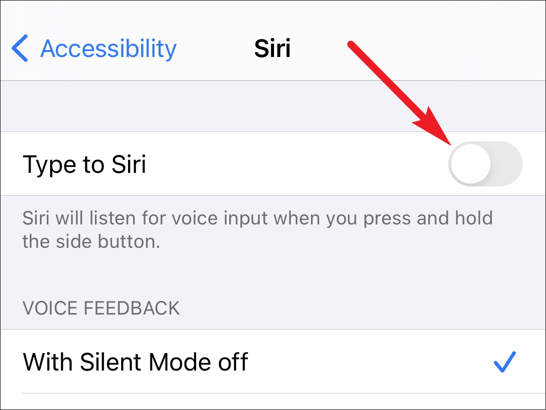 The settings for Siri will open. You’ll see that the toggle for ‘Type to Siri’ is on. Tap on it to disable it.