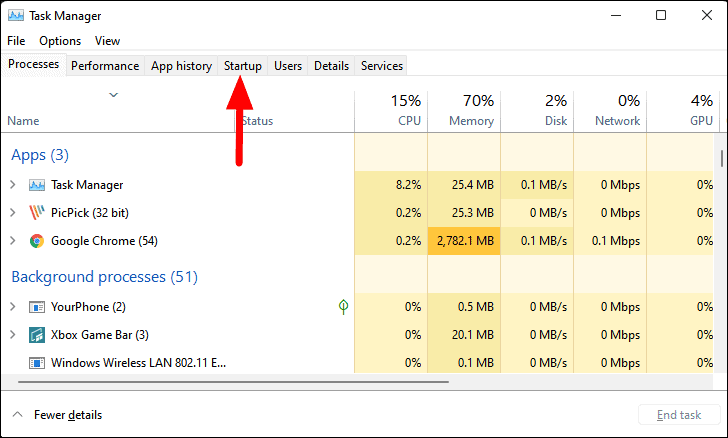 - In the Task Manager window, navigate to the Startup tab at the top.