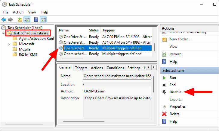 - Select the desired task, then click Disable in the Actions pane on the right side.