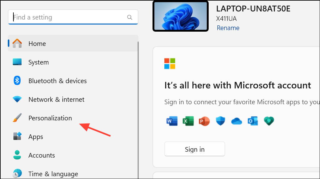 Step 2: In the sidebar, click on Personalization. This section manages all appearance-related configurations, including the taskbar.