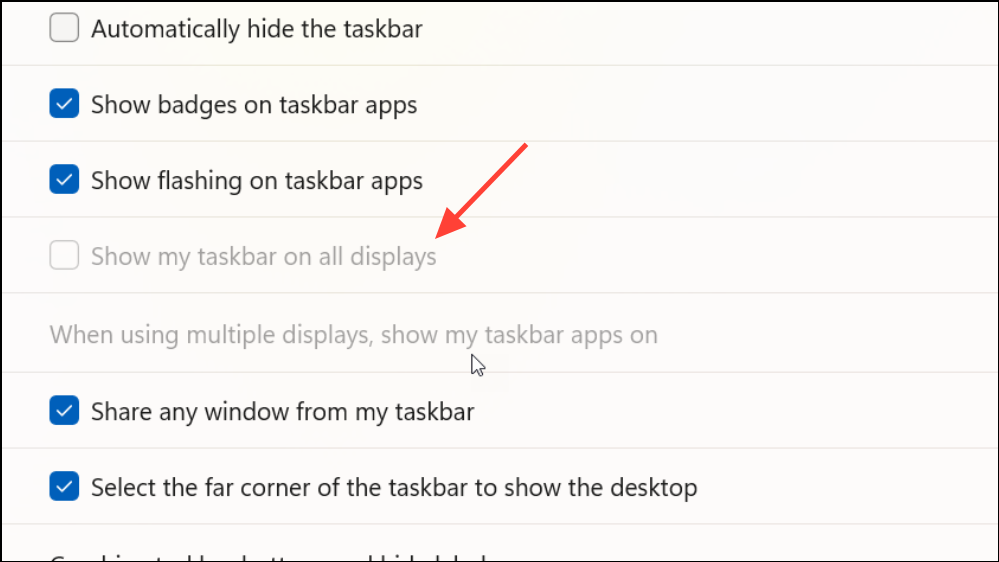 Step 5: Locate the option labeled Show my taskbar on all displays and uncheck it. As soon as you do this, the taskbar will disappear from all secondary monitors and remain only on your primary display.